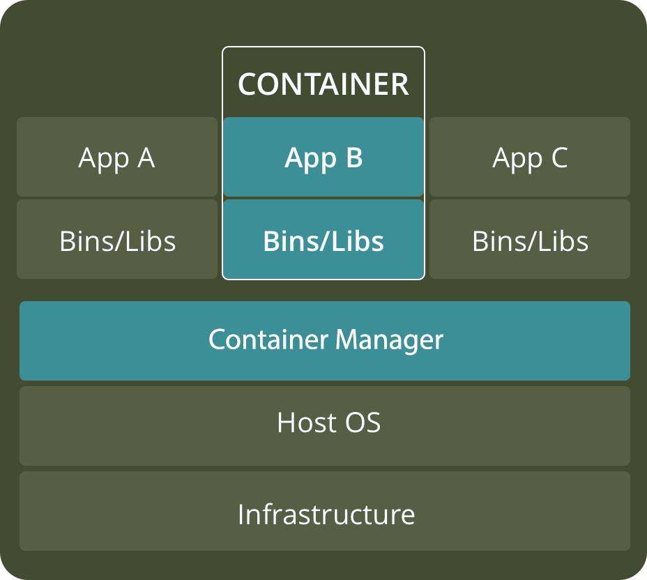 容器位于物理服务器及其主机操作系统(通常为 Linux 或 Windows)的顶部。每个容器共享主机 OS 内核,通常也共享二进制文件和库。