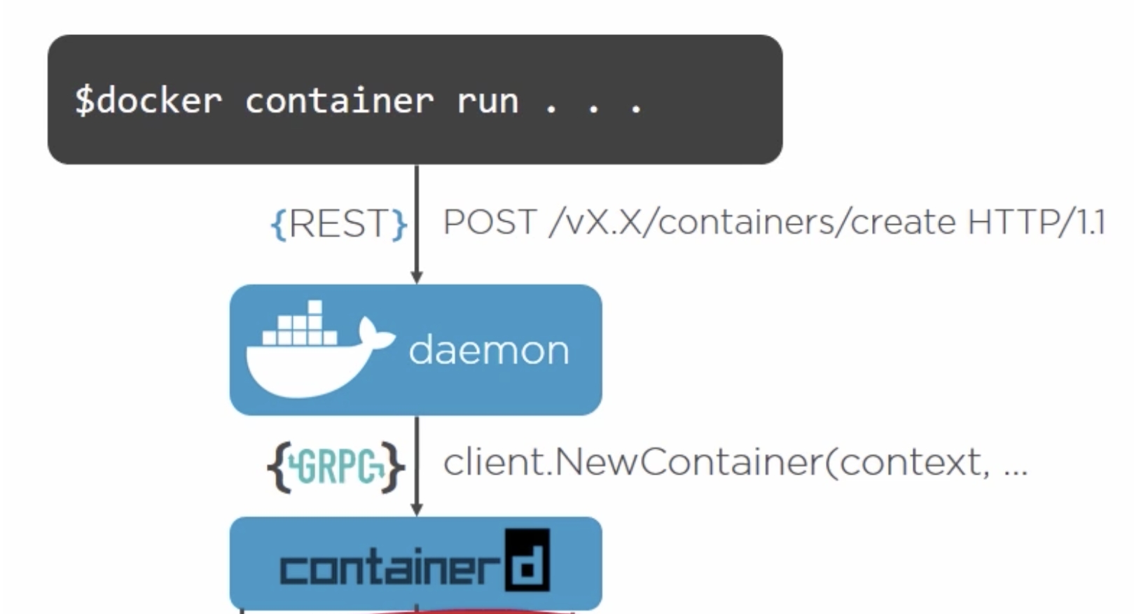 - 接收并处理 docker client 发送的命令并翻译到 Containerd 的 API 上