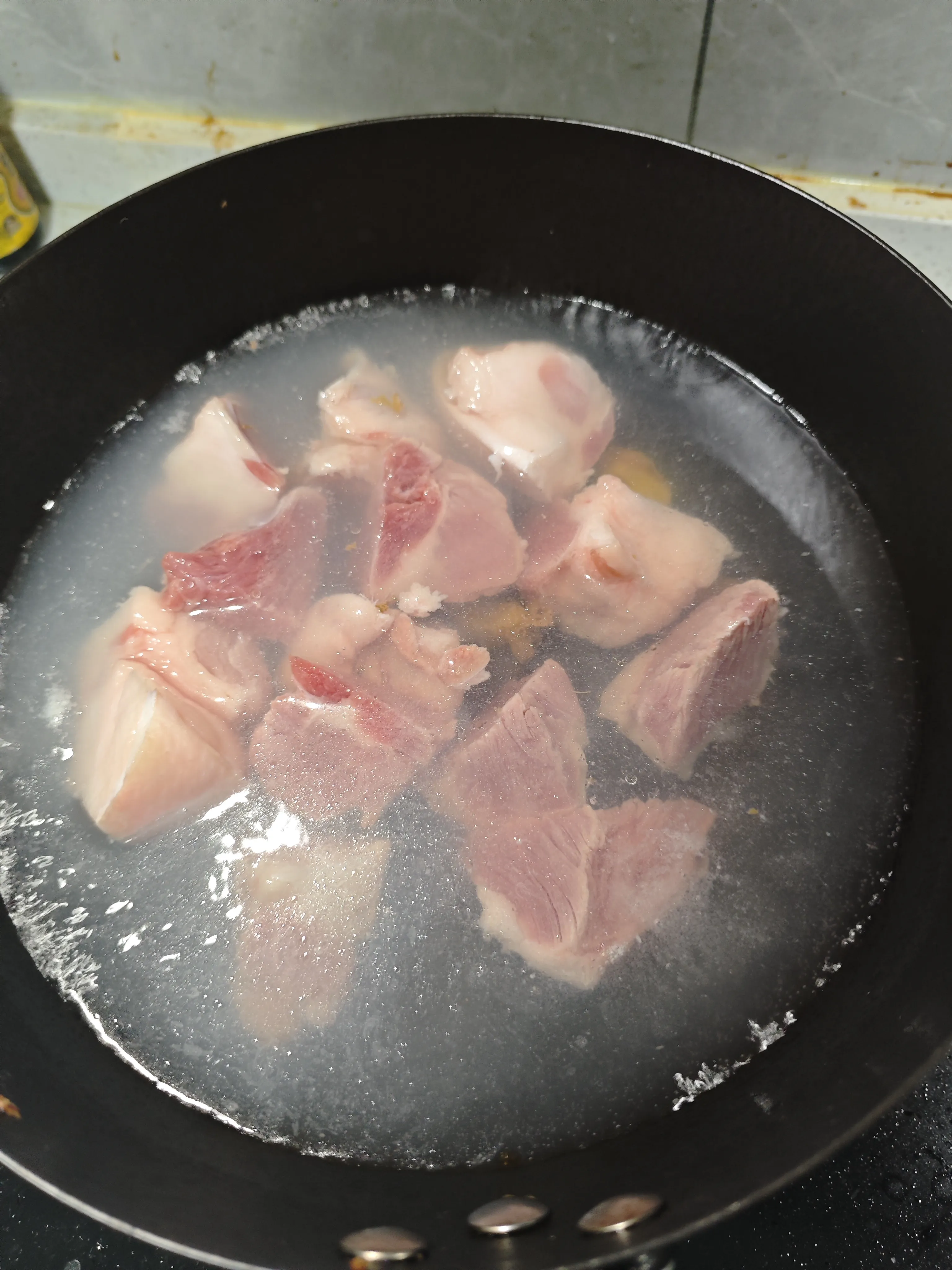 - 猪肉切小块(如果后面步骤选择用高压锅可以切大块点),配合姜片、料酒焯水
