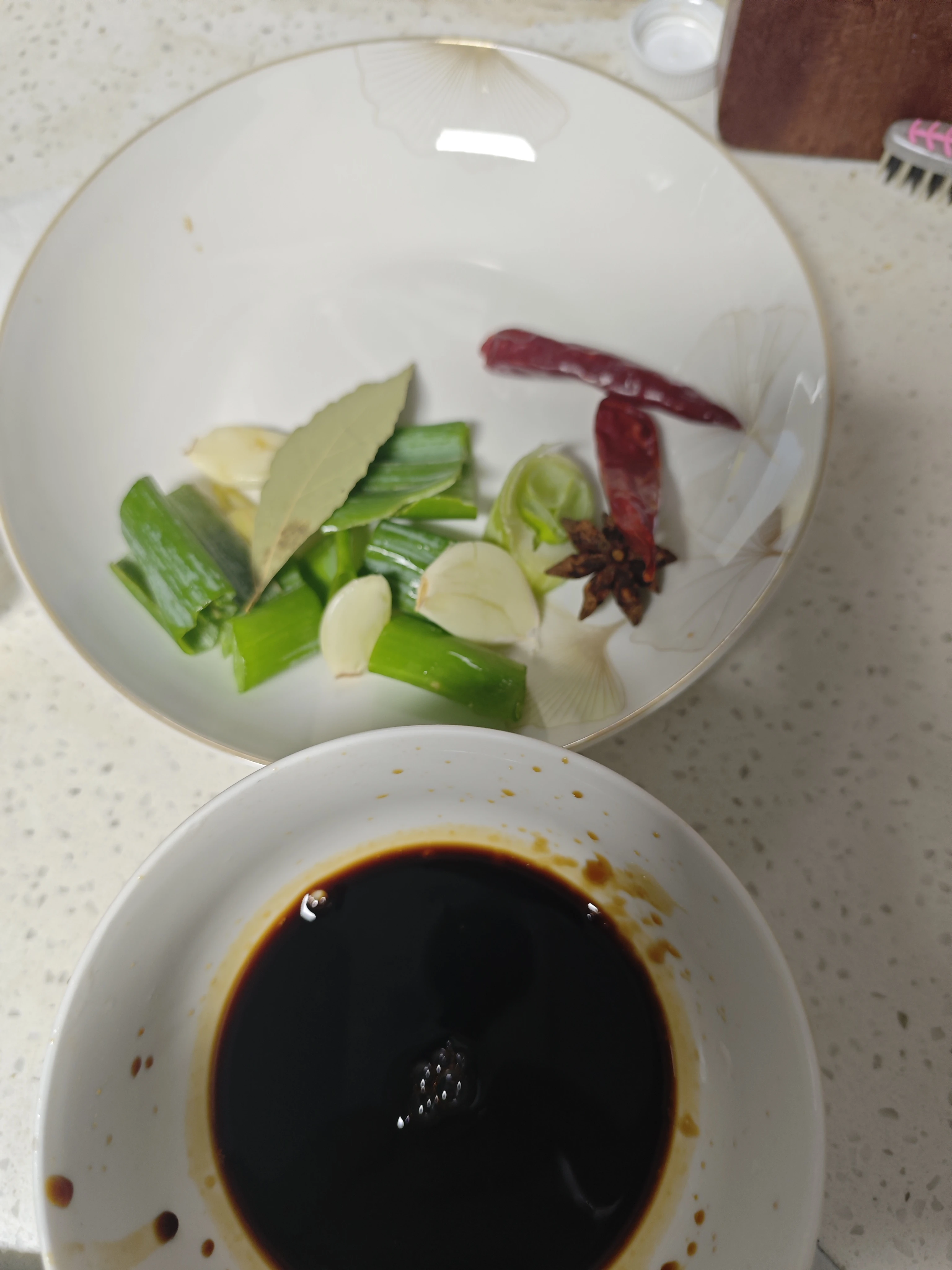 准备调料汁:生抽、老抽、耗油、干辣椒(可选)、八角、香叶、葱、蒜、盐、糖