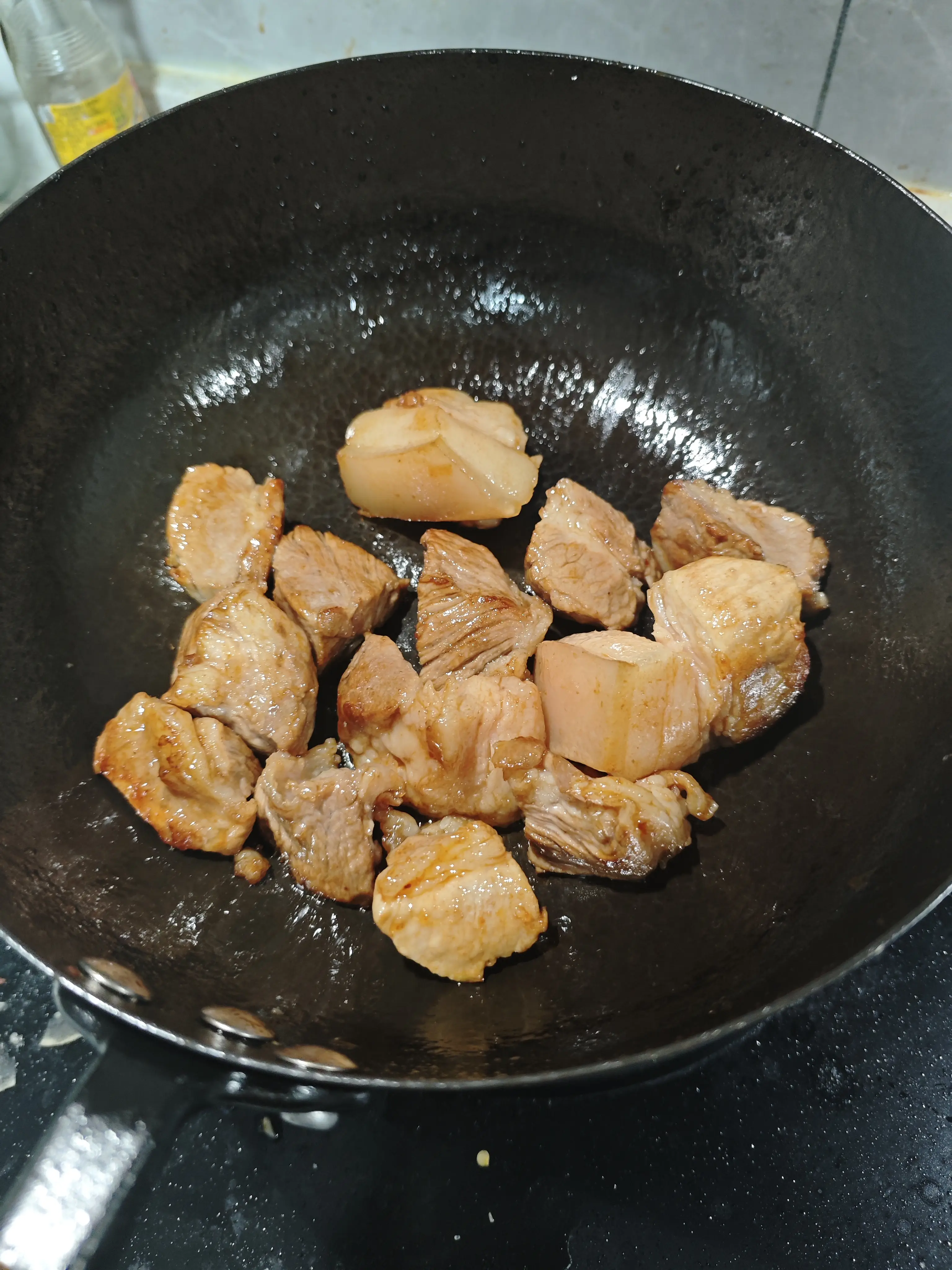 锅热加适量油(注意油量,炒糖色时油不能烧干),转小火,加适量冰糖,用锅勺敲碎,顺时针快速滑动(若冰糖融化的比较慢,需要加大火力防止粘锅),当冰糖和油的混合物开始起棕色泡沫(如果错过时机,冰糖已经焦了,要洗锅重来,不然会让成品有股焦味),加入焯完水的猪肉,换锅铲翻炒均匀