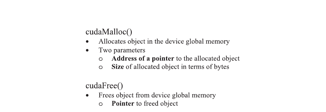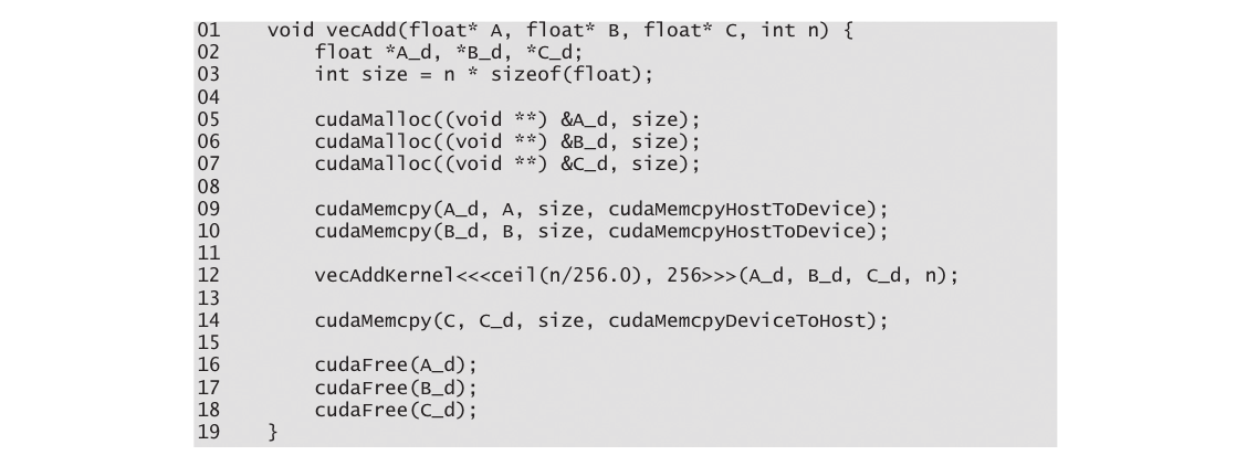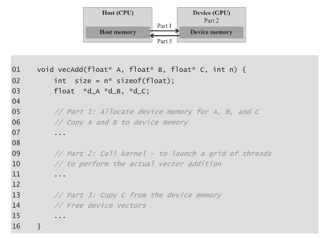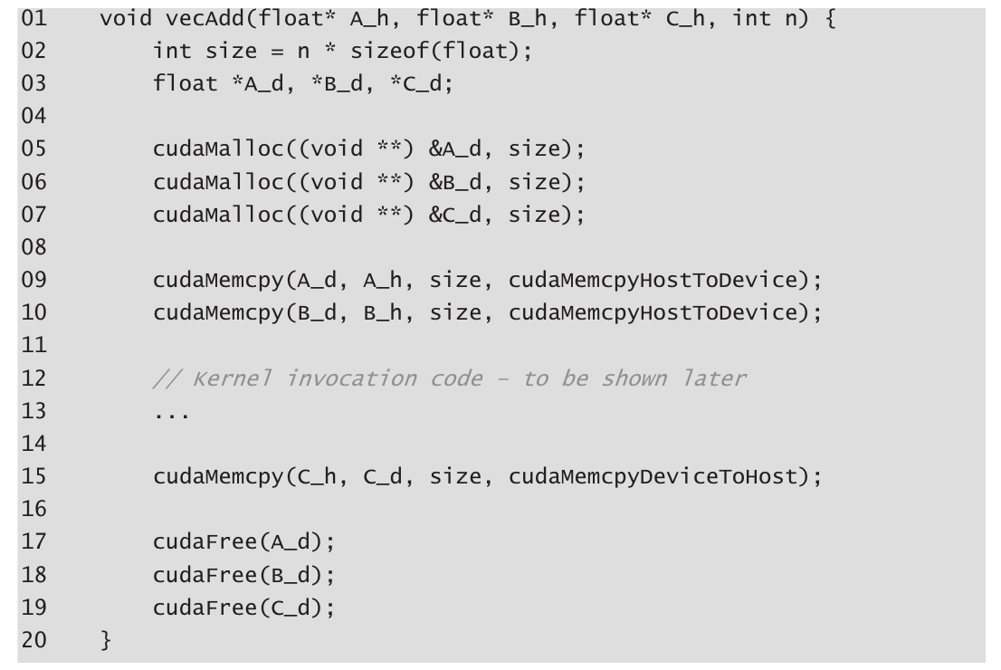 对于矢量加法核函数,在调用核函数之前,程序员需要在全局内存中分配空间并将数据从主机内存传输到全局内存中的已分配空间: