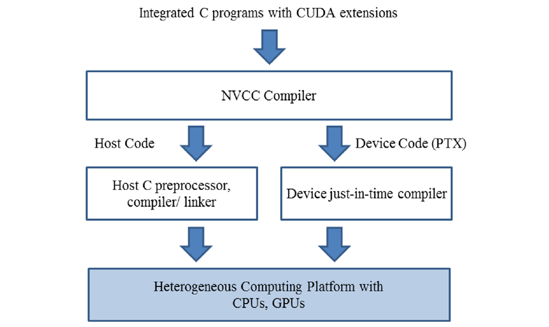 实现 CUDA C 核心需要使用多种不属于 C 语言的扩展。一旦这些扩展在代码中被使用,传统的 C 编译器就无法接受它了(类似 GNU 扩展)。代码需要由一个能够识别和理解这些扩展的编译器编译,比如 NVCC(NVIDIA C 编译器)。