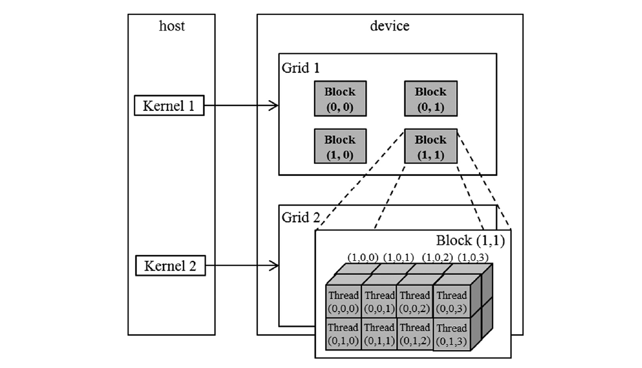 - 然后调用核函数,在设备(GPU)上启动大量线程(thread)以执行它们,由内核调用启动的所有线程被集体称为一个网格(grid)。当一个网格的所有线程都完成执行时,