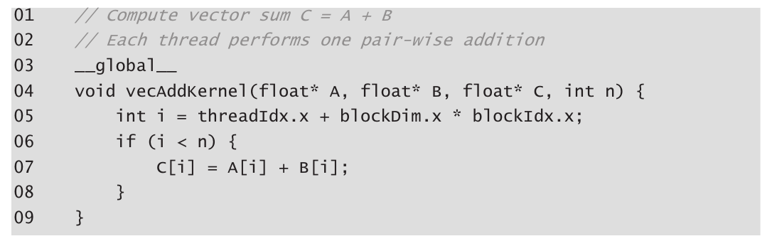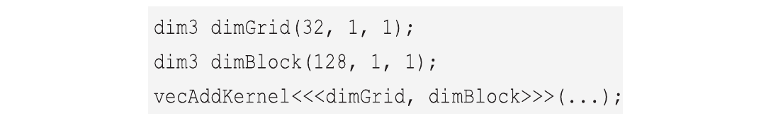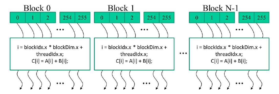 使用的线程块数量取决于向量的长度(n)。假设每个块固定运行 256 个线程。如果 n 为 750,则将使用三个线程块。如果 n 为 4000,则将使用 16 个线程块。如果 n 为 2000000,则将使用 7813 个块。请注意,所有线程块都在向量的不同部分上操作。它们可以以任意顺序执行。程序员不能对执行顺序做出任何假设。