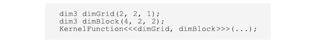 一个网格是一个三维(3D)的块数组,每个块是一个三维(3D)的线程数组。在调用内核时,程序需要指定每个维度中网格和块的大小。这是通过内核调用语句的执行配置参数(在 <<<…>>>