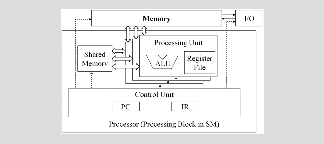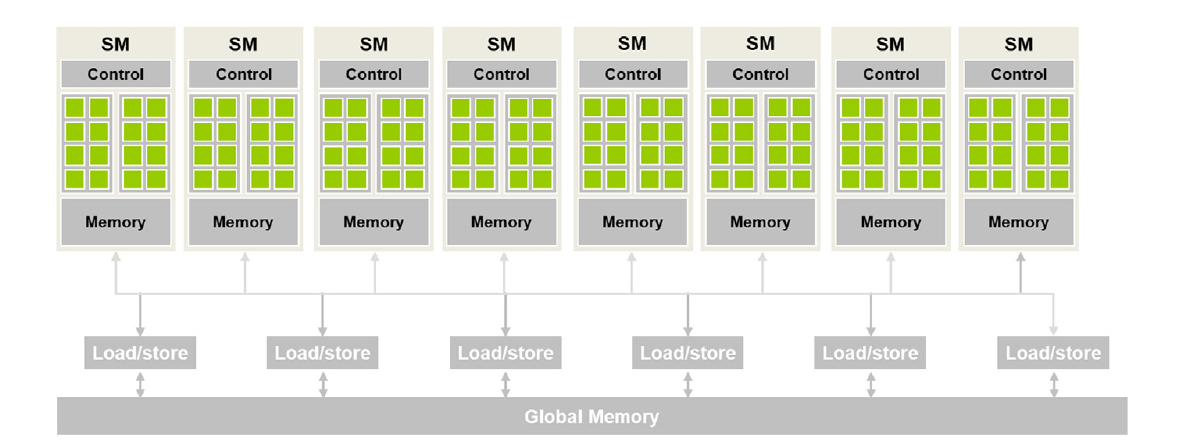 在 GPU 架构中,改进了冯诺依曼模型,使用单指令多数据流(Single Instruction, Multiple Data, SIMD)模型,多个处理单元共享 PC 寄存器,也就是说每个处理单元(CUDA 核心)每次执行的指令都相同,区别仅仅是访问的数据(共享内存、全局内存)的位置不同:
