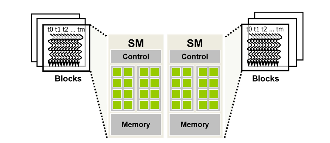 线程按块逐块分配给 SM 的方式确保了同一块中的线程同时在同一个 SM 上调度。这一保证使得同一块中的线程能够更加高效的交互(相比与位于不同块的线程,就像操作系统中线程间通信效率要高于进程间通信)。包括栅栏同步和共享位于 SM 上的低延迟内存