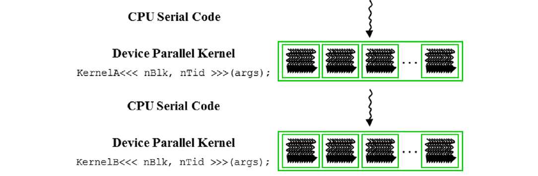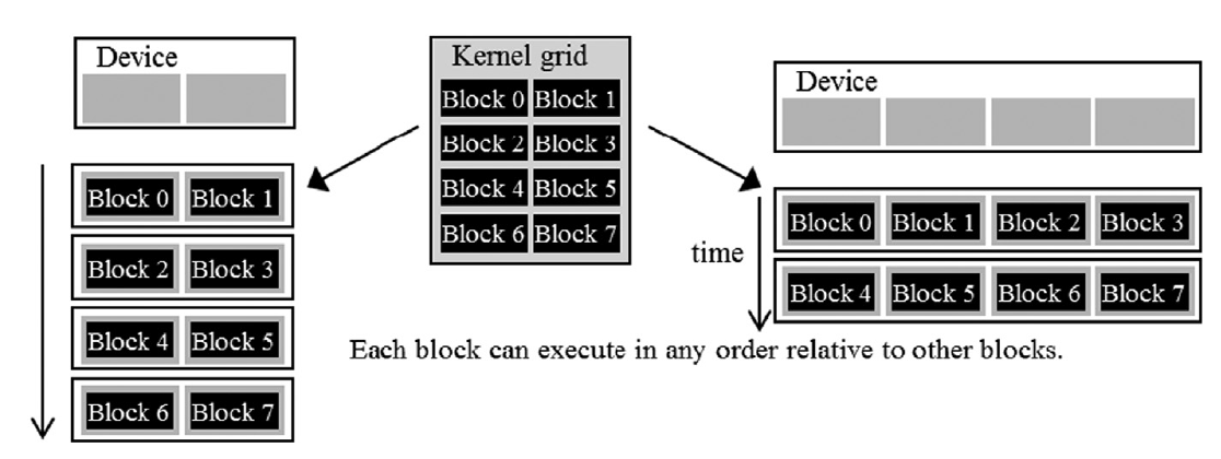 屏障同步,CUDA 运行时系统可以以任意顺序执行不同的块,因为它们中的任何一个都不需要等待其他块。
