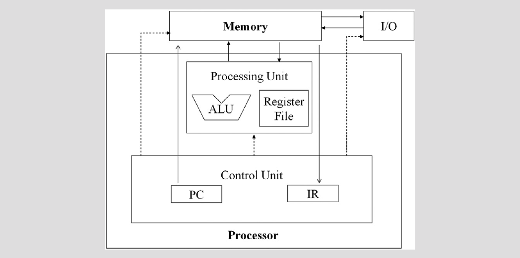 冯诺依曼模型中,处理单元从 PC 中取一条指令到 IR 并执行,即使是多核 CPU 也同样要遵守该架构,每个核都有一个 PC 寄存器和一个 IR 寄存器: