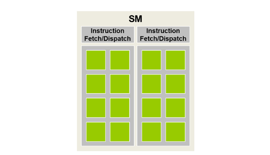 在 GPU 中,每个 SM 都包含几组这样的结构,每组都包含一定数量的 CUDA 核心,每组之间共享控制单元(PC 和 IR 寄存器),这样的组称为 warp,warp 是 SM 中线程调度的单元: