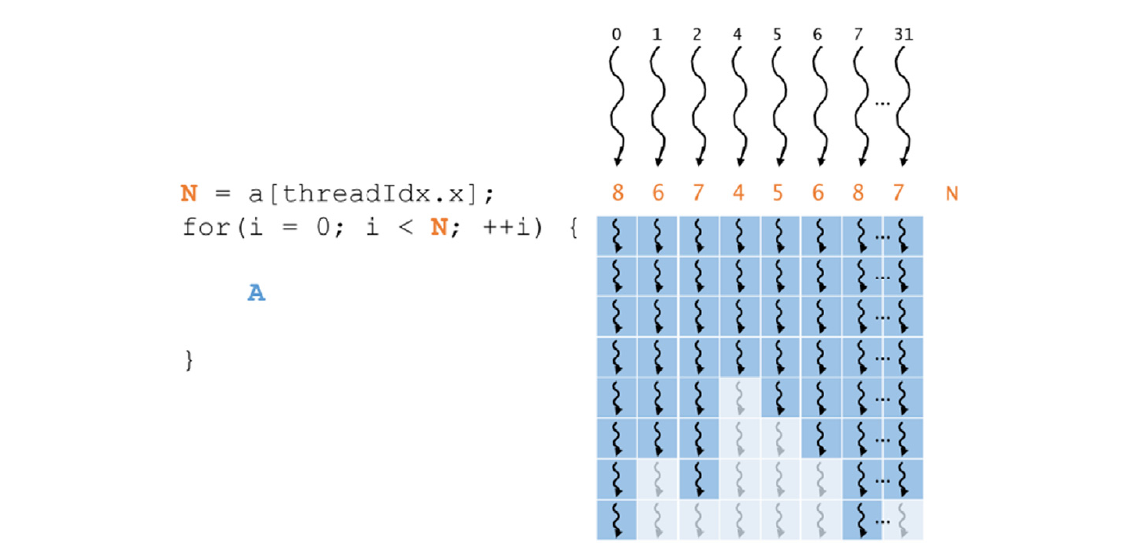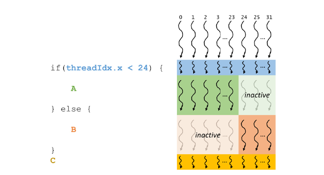 然而,分支的代价是硬件需要执行额外的通道,以允许 warp 中的不同线程做出自己的决策,以及每个通道中由非活动线程消耗的执行资源: