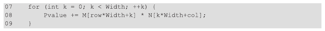 以矩阵乘法为例,在循环的每次迭代中,会执行一个浮点乘法和一个浮点加法,这会导致两次全局内存访问。全局内存访问会从 M 和 N 数组中获取元素: