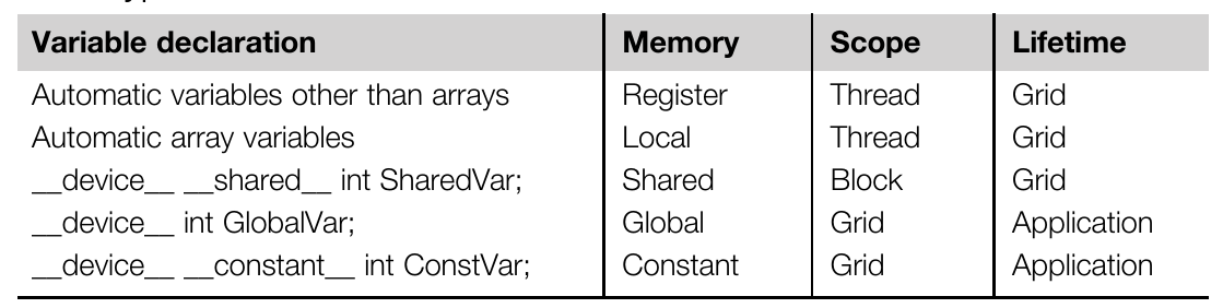 - 寄存器: 线程私有,保存自动变量(栈),单个 warp 内每个线程的寄存器数量支持配置。核函数使用的自动变量越多,每个线程使用的寄存器就越多,因为单个 SM 的寄存器数量有限,所以能同时执行的线程就越少(注意即使是阻塞或休眠的 warp 也需要占用寄存器)