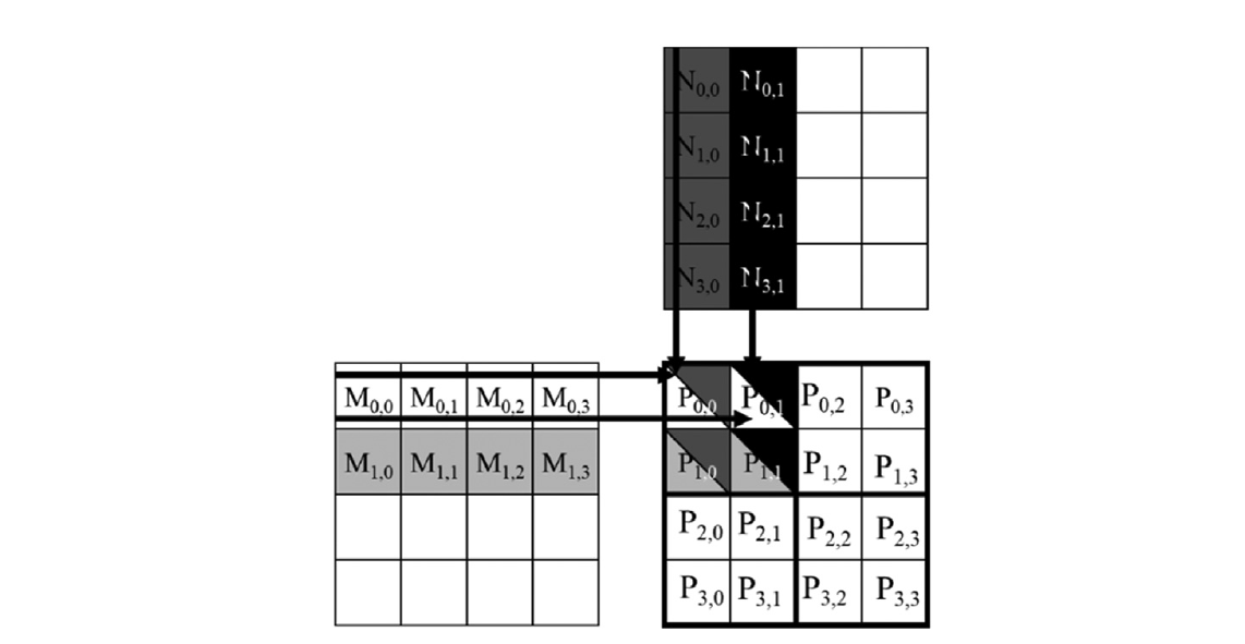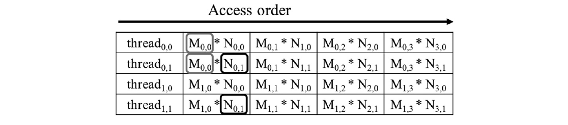 也就是第一个线程需要从全局内存访问 M 的第 1 行和 N 的第 1 列的所有数据,以此类推