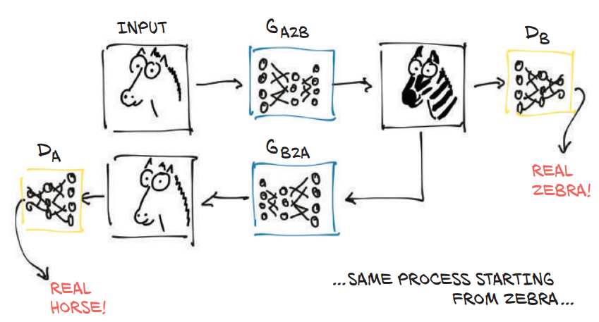 我们进行图像转换的目的一般是创建风格化的内容,也就是说马转为斑马的过程中,其姿势、形态、大小等都需要一致(语义一致),如果只进行单向的转换,很有可能导致姿势等状态的变化,比如走路的马变成趴着的斑马,和我们预期的不相同。