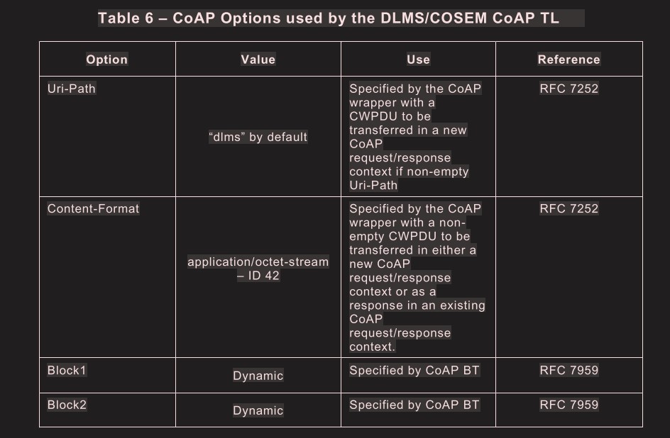 - s7.3.5 Protocol specification of the DLMS/COSEM CoAP transport layer