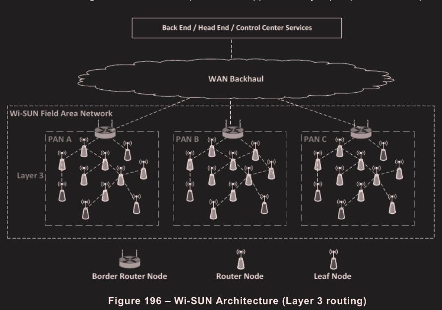 的 IPv6 无线网状网络,专为关键基础设施项目设计。每个个人区域网络(PAN)被设计成用一个边界路由器支持数千个路由器设备。一个 FAN 可以由多个 pan 组成,允许单个网络扩展到数百万个设备,见图 196。