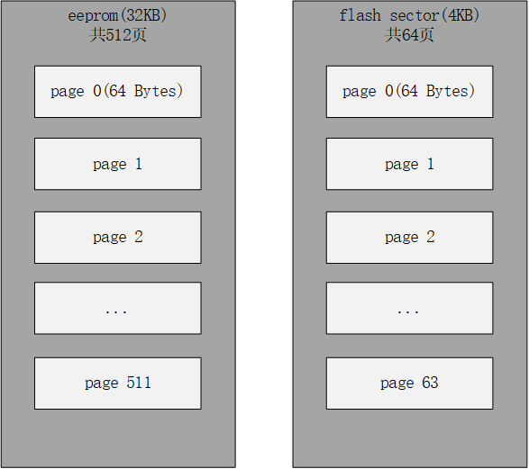 flash 使用和 eeprom 相同的页大小,为 64Bytes。一个 sector 为 4096Bytes,包含了 4096/64 = 64 个页。