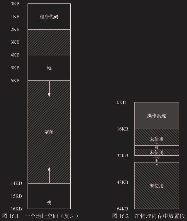 中给每个逻辑段(segment)引入一对基址和界限寄存器。这样就能分别对这三个段做映射,三个段的顺序和位置完全可以在物理地址空间中随意排列,只要映射到虚拟地址中的位置符合进程结构就行: