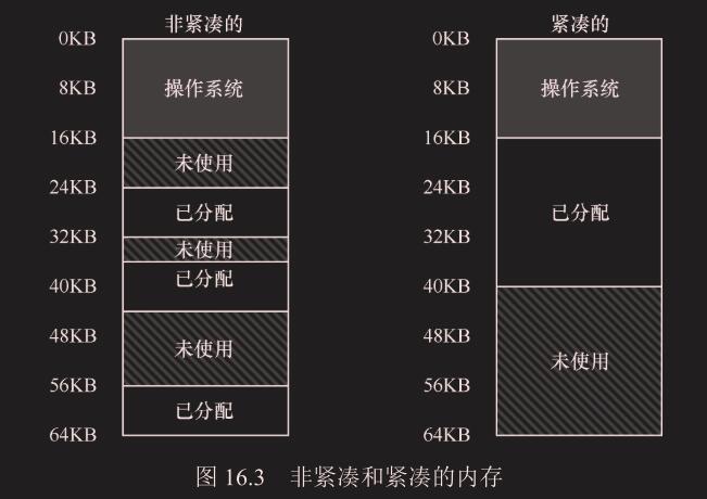 操作系统先终止运行的进程,将它们的数据复制到连续的内存区域中去,改变它们的段寄存器中的值,指向新的物理地址,从而得到了足够大的连续空闲空间