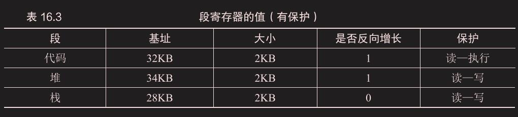 有了保护位,前面描述的硬件算法也必须改变。除了检查虚拟地址是否越界,硬件还需要检查特定访问是否允许。如果用户进程试图写入只读段,或从非执行段执行指令,硬件会触发异常,让操作系统来处理出错进程。