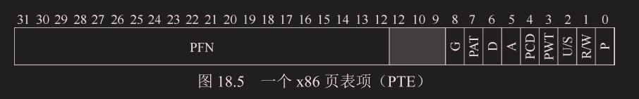 图 18.5 显示了来自 x86 架构的示例页表项[I09]。它包含一个存在位(P),确定是否允许写入该页面的读/写位(R/W) 确定用户模式进程是否可以访问该页面的用户/超级用户位(U/S),有几位(PWT、PCD、PAT 和 G)确定硬件缓存如何为这些页面工作,一个访问位(A)和一个脏位(D),最后是页帧号(PFN)本身。