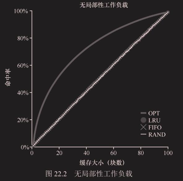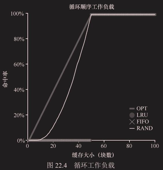 ,其中依次引用 50 个页,从 0 开始,然后是 1,…,49,然后循环,重复访问。展示了 LRU 或者 FIFO 的最差情况。