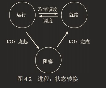 可以根据操作系统的载量,让进程在就绪状态和运行状态之间转换。从就绪到运行意味着该进程已经被调度(scheduled)。从运行转移到就绪意味着该进程已经取消调度(descheduled)。一旦进程被阻塞(例如,通过发起 I/O 操作),OS 将保持进程的这种状态,直到发生某种事件(例如,I/O 完成)。此时,进程再次转入就绪状态(也可能立即再次运行,如果操作系统这样决定)。