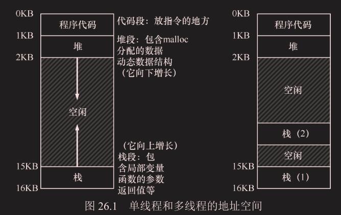 在多线程的进程中,每个线程独立运行,当然可以调用各种例程来完成正在执行的任何工作。不是地址空间中只有一个栈,而是每个线程都有一个栈。