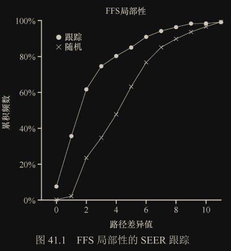 图中 y 轴表示文件路径距离小于等于 x 轴值时的情况的比例,如小黑点的线上,有 7% 左右的访问都是同一文件(路径为 0),有 40% 左右的访问都是同目录下的(路径为 0 或 1,包括访问自己)