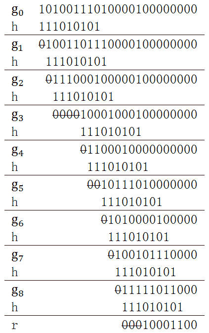 算法求 101001110100001 的效验码。CRC-8 标准的 h(x) = x^8 + x^7 + x^6 + x^4 + x^2 + 1,既 h 是 9 位的二进制串 111010101。