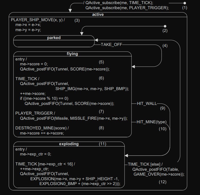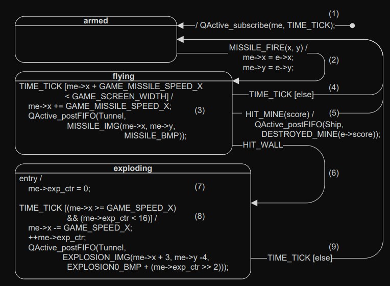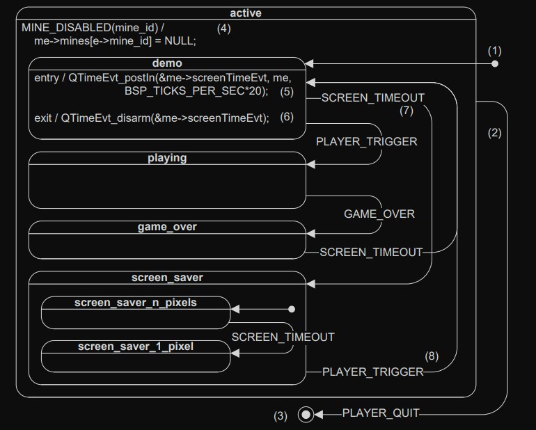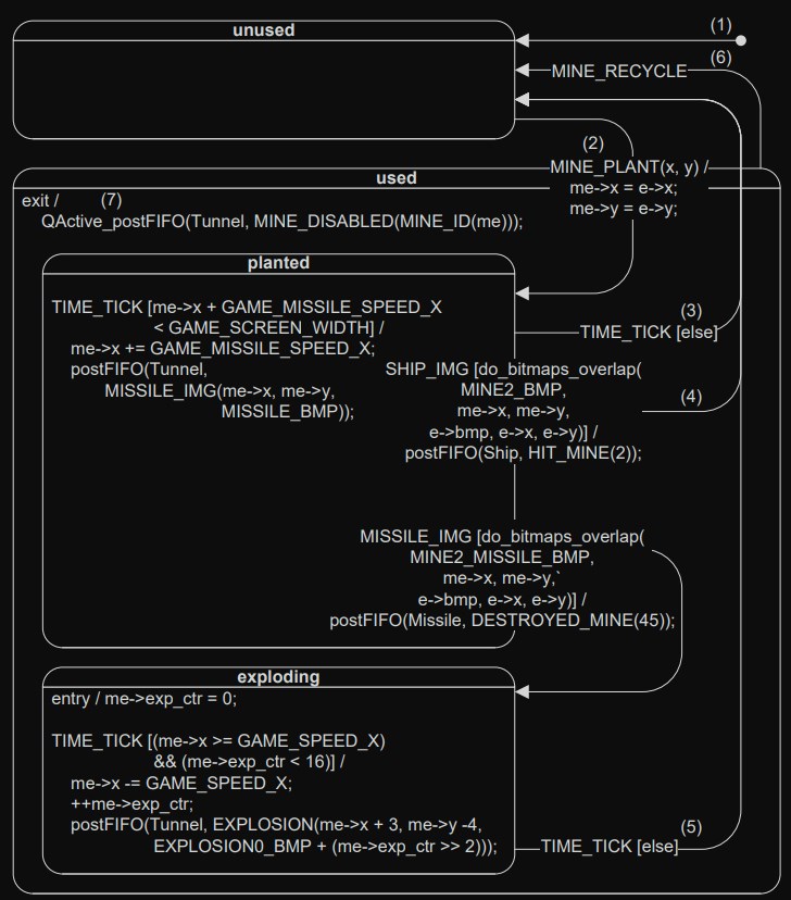 Mine 也是一个层次状态机,但不是主动对象,而是 Tunnel 的构件,共享其事件队列和优先级。
