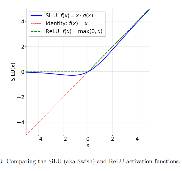 \[\text{FFN}(x) = \text{SwiGLU}(x, W_1, W_2, W_3) = W_2(\text{SiLU}(W_1 x) \odot W_3 x)\]其中: