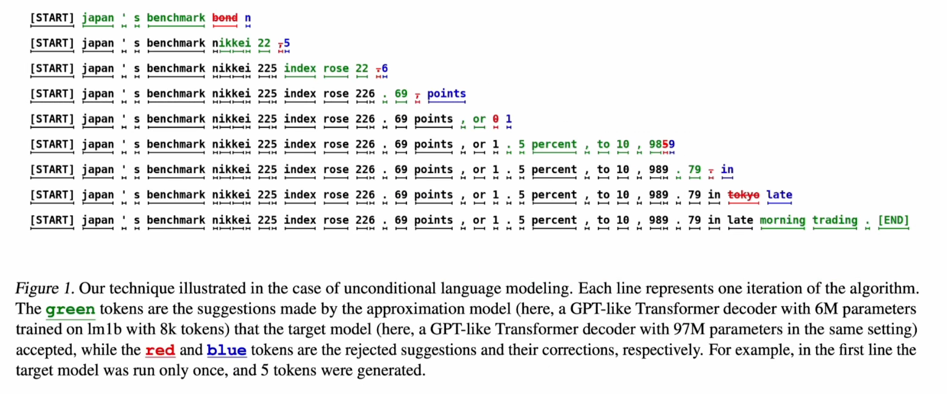而且因为推理时只能一个一个 token 生成,不能并行处理,进一步降低了速度。为了提高推理速度,有一种思路是利用一个小模型先推理一遍,因为参数小,推理也很快,但质量不太行,这时候再让大模型进行 check,这个 check 过程和训练很像,都是已经有完整的输入后进行的,可以并行处理提高效率,check 主要做的事就是检查每个 token 和自己预测的是否相同,发现错误时就主动从错误的地方再重新生成一遍。因为可以并行,理想情况下,大模型 check 过程和生成一个 token 的时间就是一样的。