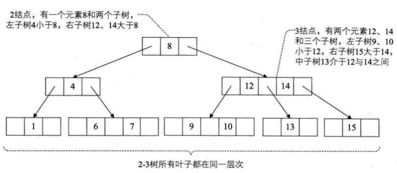 (或没有孩子),一个 3 结点要么没有孩子,要么具有 3 个孩子。如果某个 3 结点有孩子的话,左子树包含小于较小元素的元素,右子树包含大于较大元素的元素,中间子树包含介于两元素之间的元素。 - 2-3 树中所有