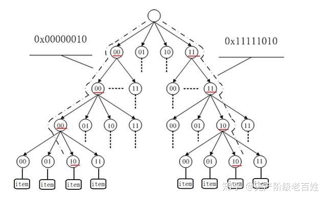 如图是 2 比特的 radix 树,每个节点包含 2 比特的 key,从根开始到叶子的一条路径就是一个 key 值,叶子节点指向该 key 对应的 value
