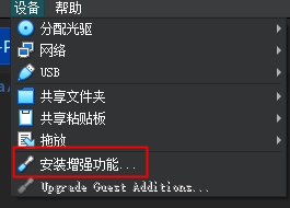 虚拟机运行时,点击设备->安装增强功能,将自动为当前运行的虚拟机挂载一个光驱: