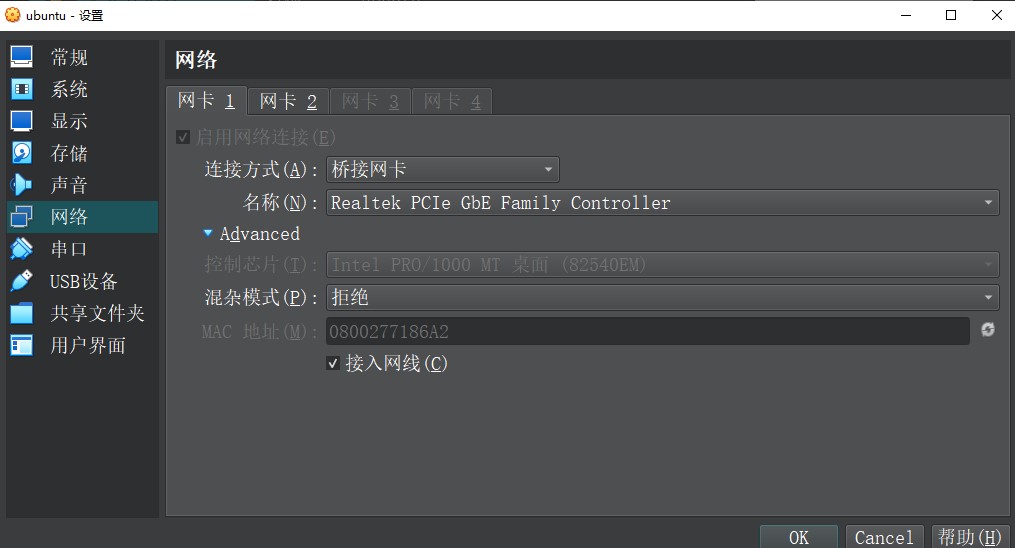 为 NAT 网卡,使用 dhcp 功能获取地址。注意将静态 ip 地址和 dns 服务器填写为正确的地址。