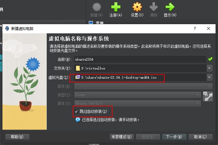 新建虚拟机,选中安装镜像,如果想在安装过程手动配置(如开启 SSH server 功能),勾选跳过自动安装: